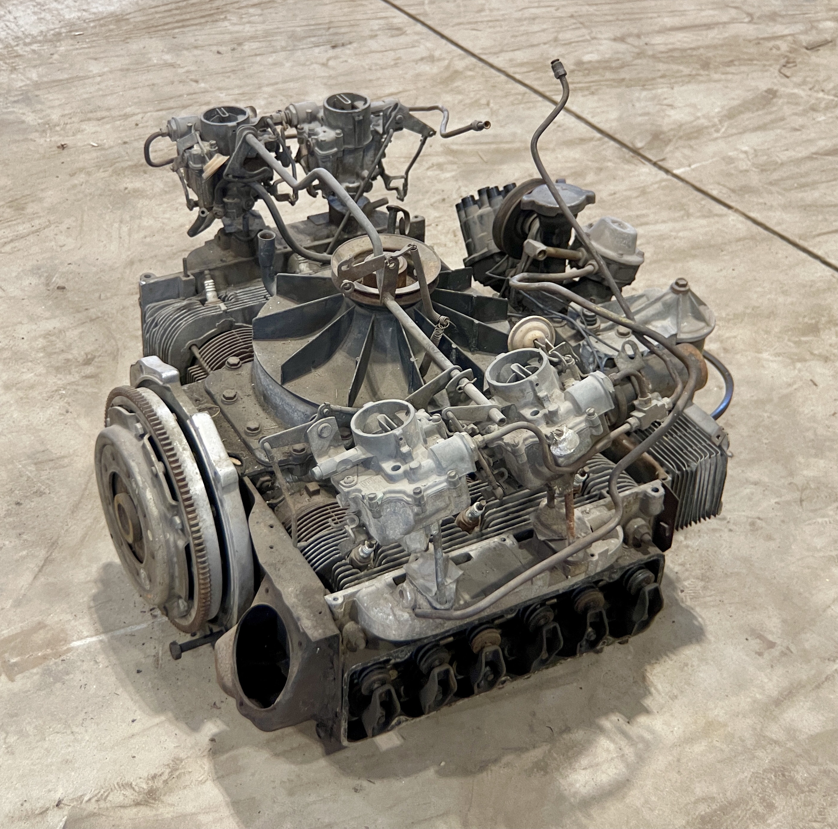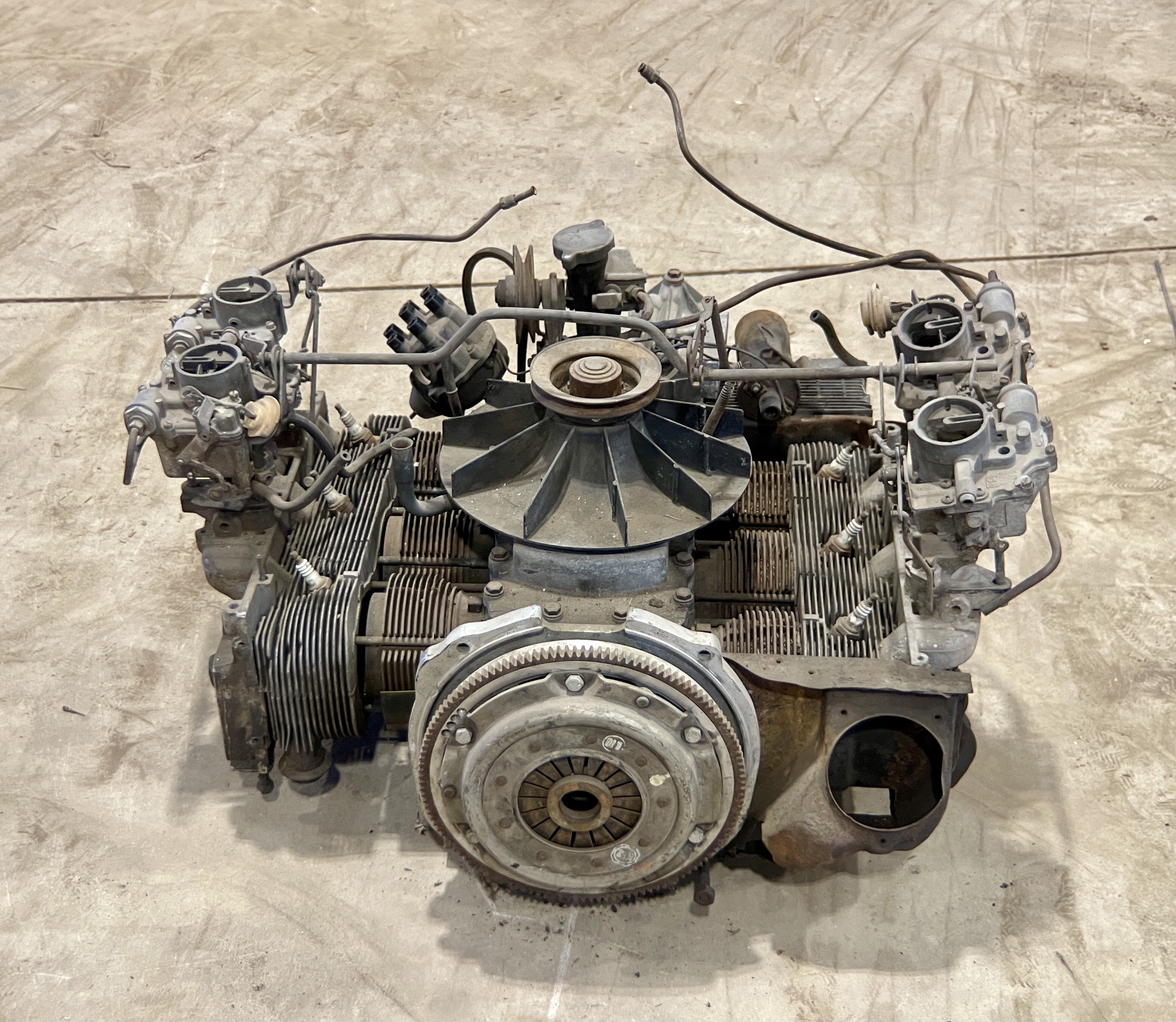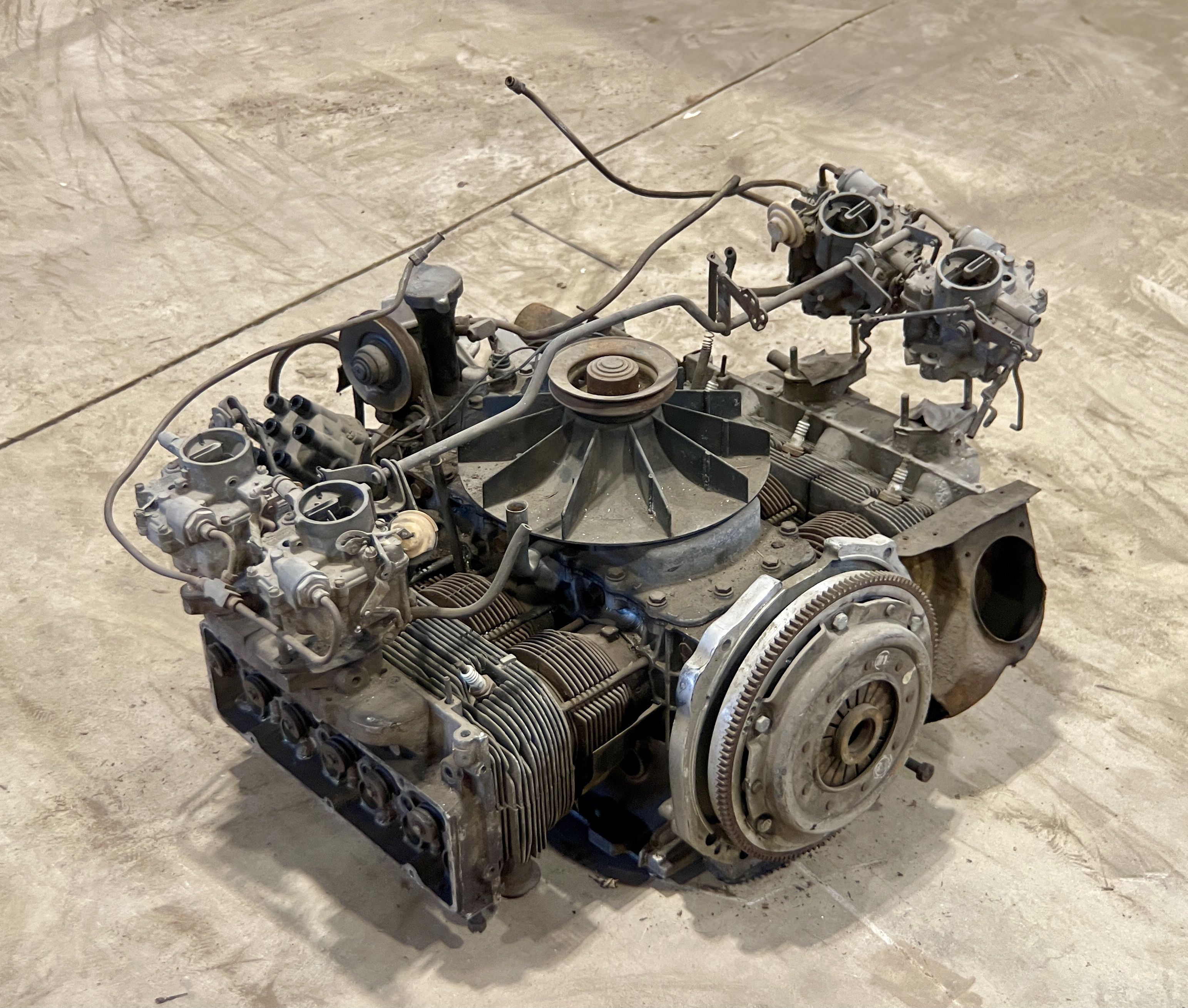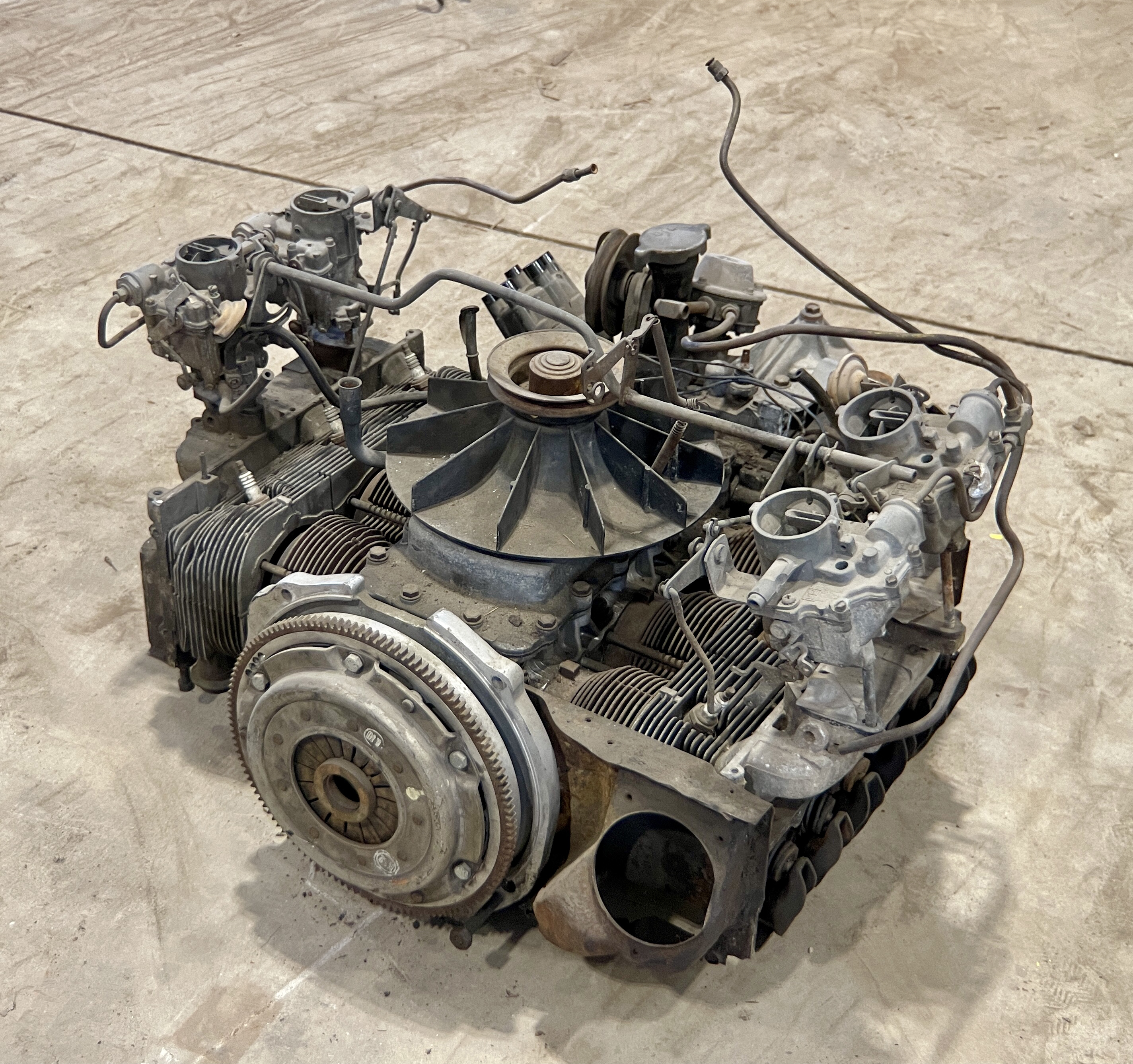 THIS MOTOR HAS BEEN MODIFIED VIA AN ADAPTER PLATE (CASTING), REPLACING THE TRADITIONAL CORVAIR BELL HOUSING, ALLOWING IT TO BOLT TO A VW TRANSAXLEBOTH THE FLYWHEEL AND CLUTCH ASSEMBLY HAVE ALSO BEEN SWAPPED FOR VW PERFORMANCE PARTS.IT ALSO APPEARS THAT THIS CORVAIR TURBO ENGINE WAS “REVERSED” TO RUN IN A CLOCKWISE DIRECTION, AND NOT THE STANDARD STOCK DIRECTION, THEREBY ELIMINATING THE NEED TO FLIP THE RING GEAR ON THE VOLKSWAGEN TRANSAXLE.