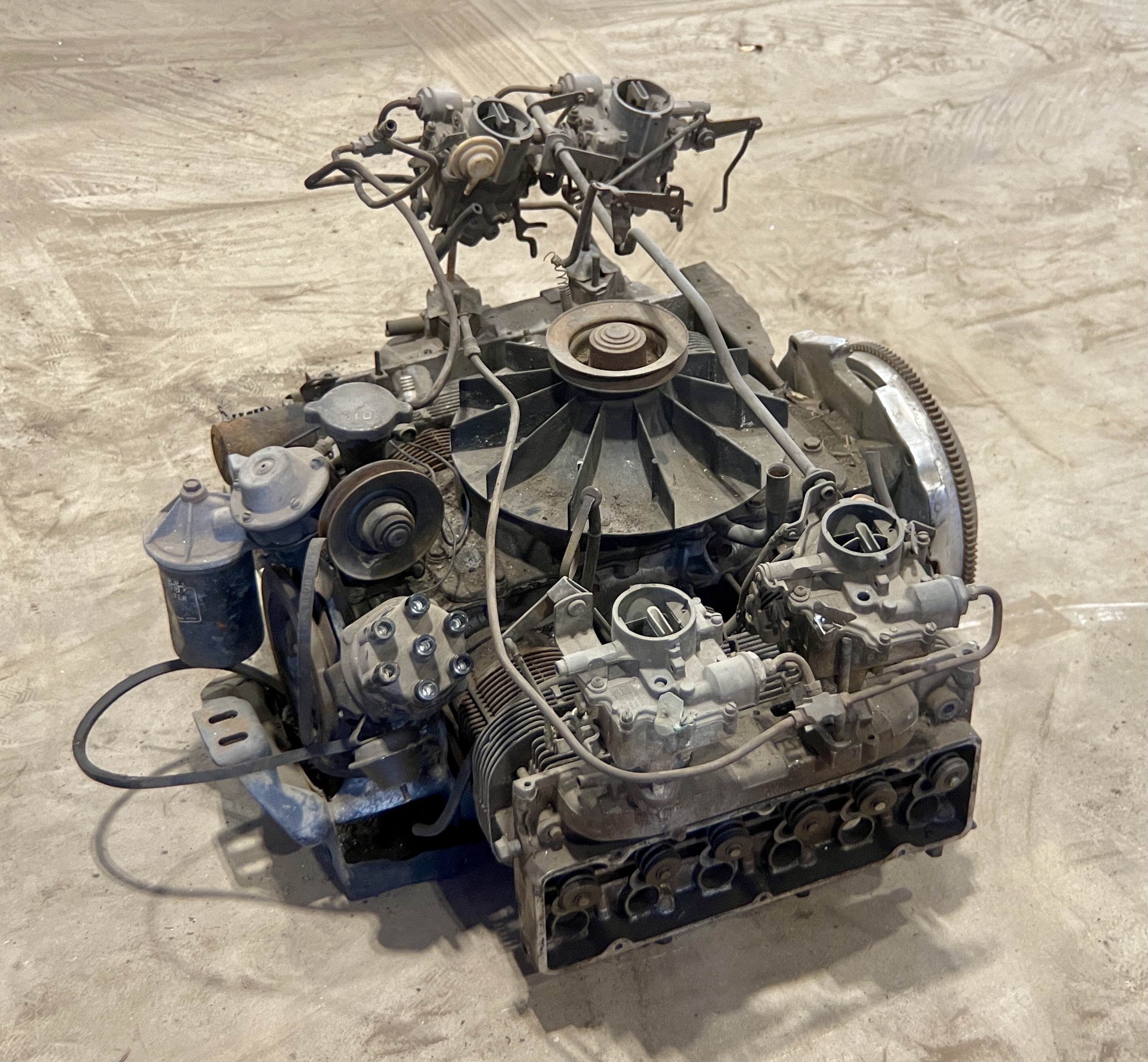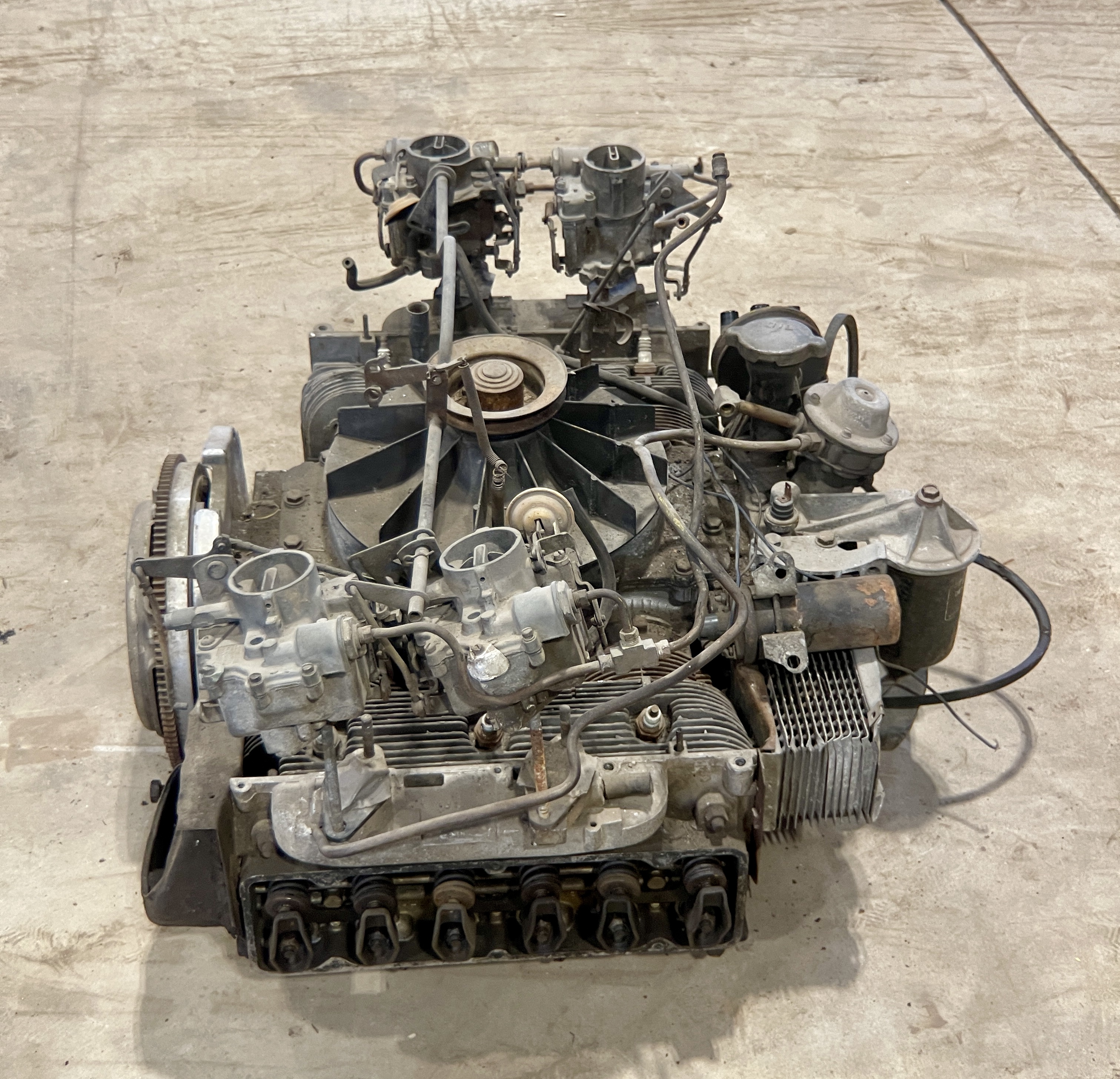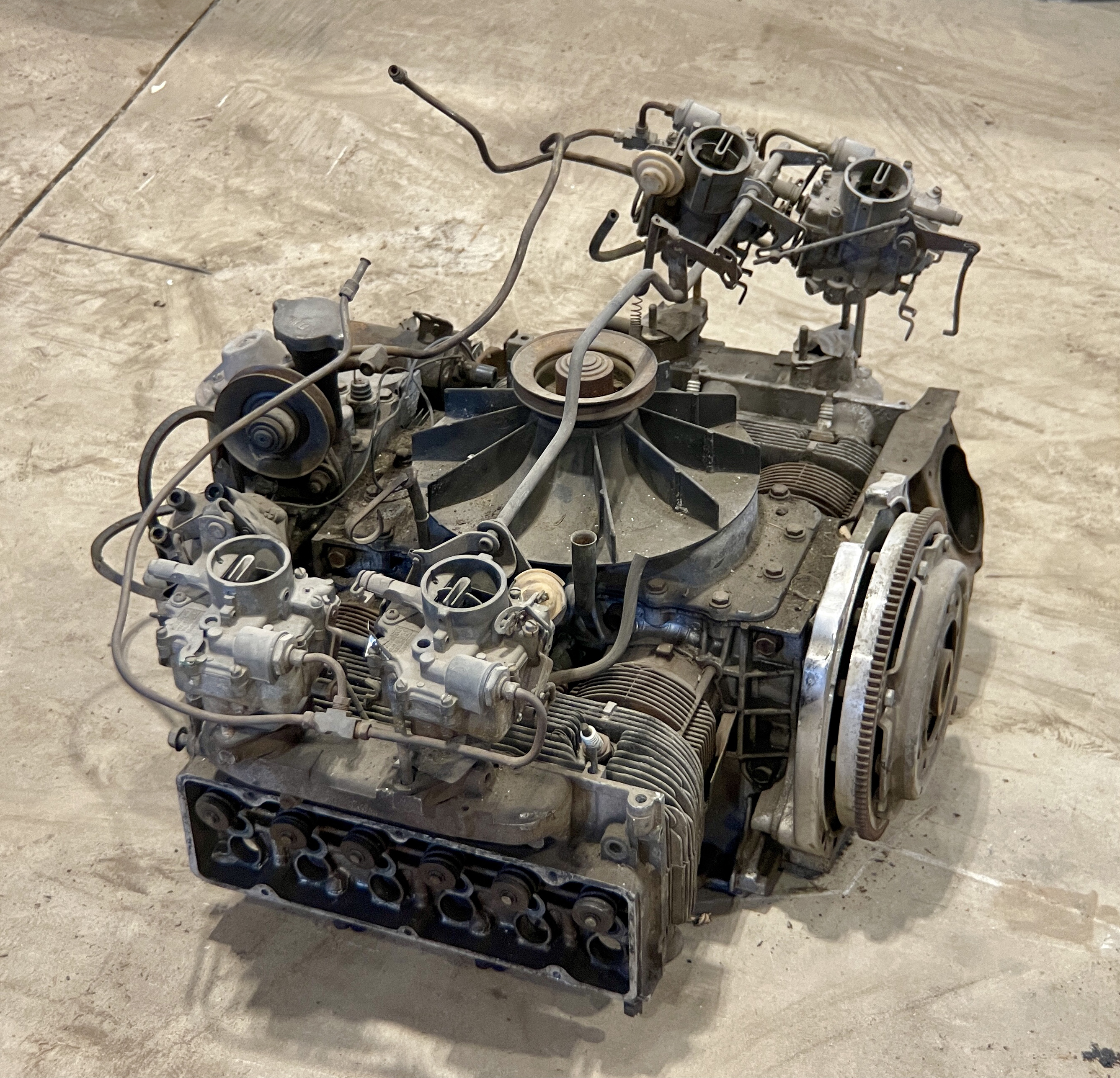 THIS MOTOR HAS BEEN MODIFIED VIA AN ADAPTER PLATE (CASTING), REPLACING THE TRADITIONAL CORVAIR BELL HOUSING, ALLOWING IT TO BOLT TO A VW TRANSAXLEBOTH THE FLYWHEEL AND CLUTCH ASSEMBLY HAVE ALSO BEEN SWAPPED FOR VW PERFORMANCE PARTS.IT ALSO APPEARS THAT THIS CORVAIR TURBO ENGINE WAS “REVERSED” TO RUN IN A CLOCKWISE DIRECTION, AND NOT THE STANDARD STOCK DIRECTION, THEREBY ELIMINATING THE NEED TO FLIP THE RING GEAR ON THE VOLKSWAGEN TRANSAXLE.