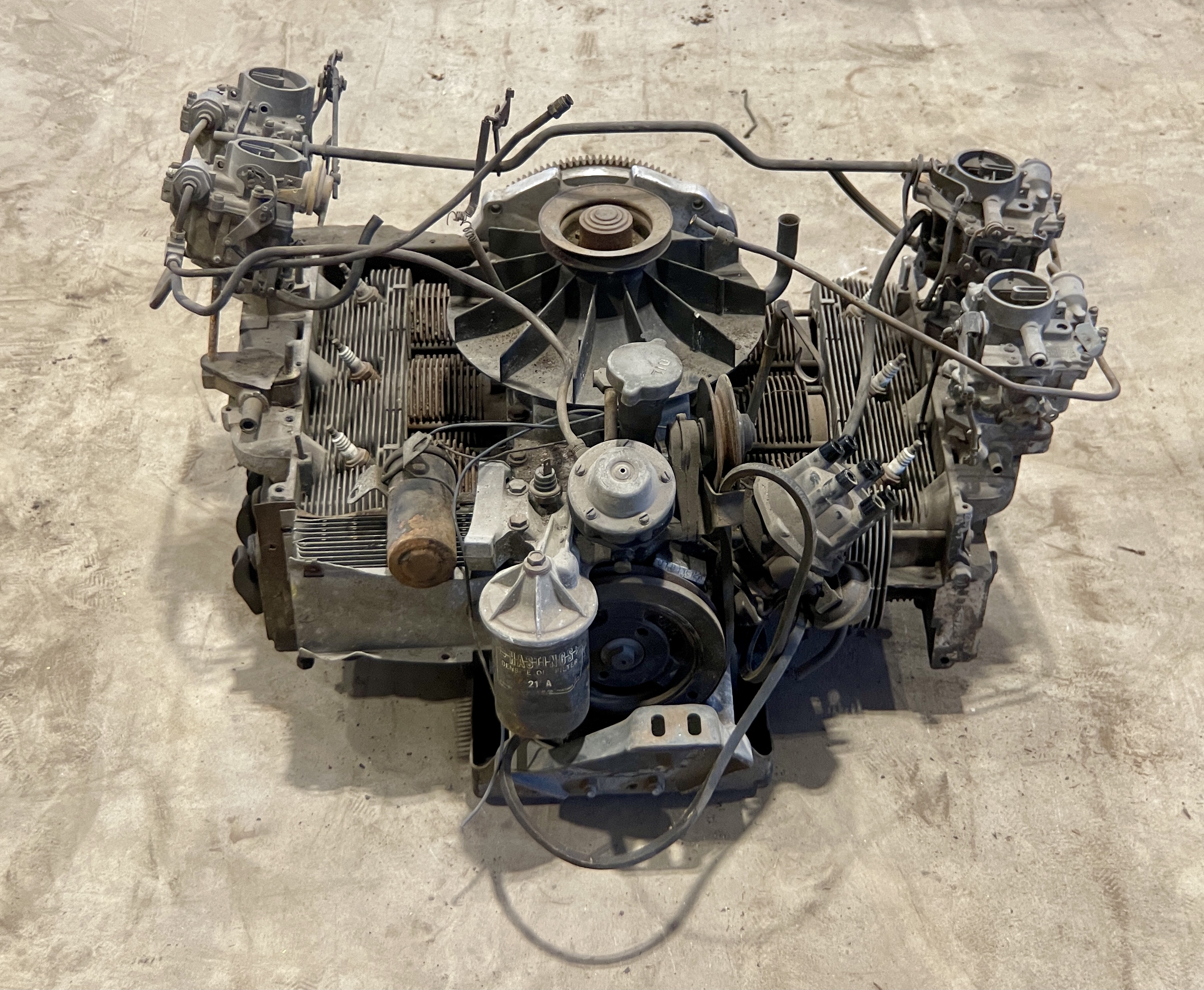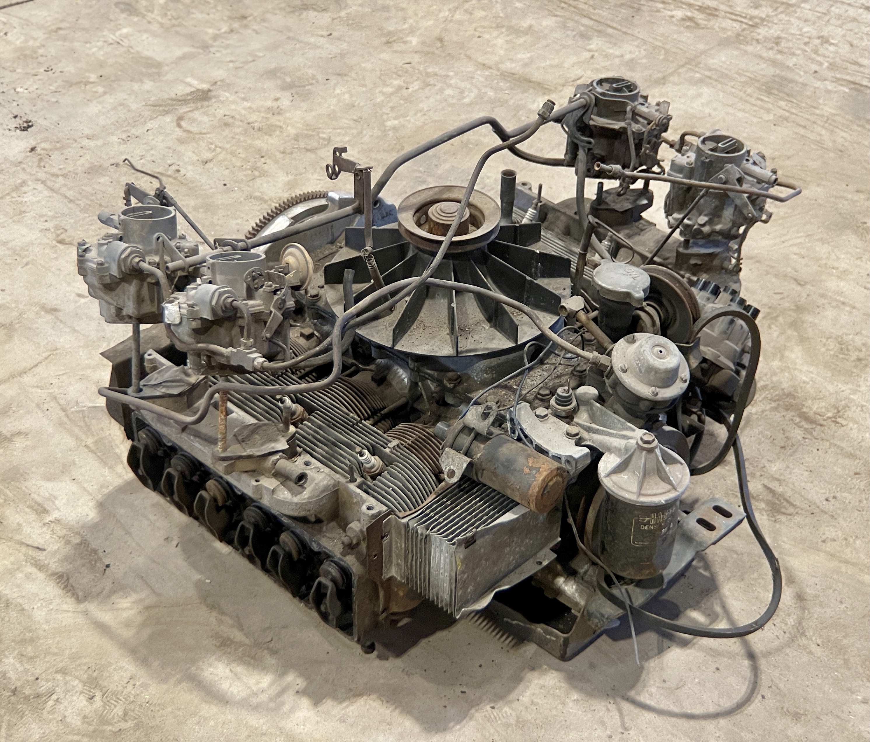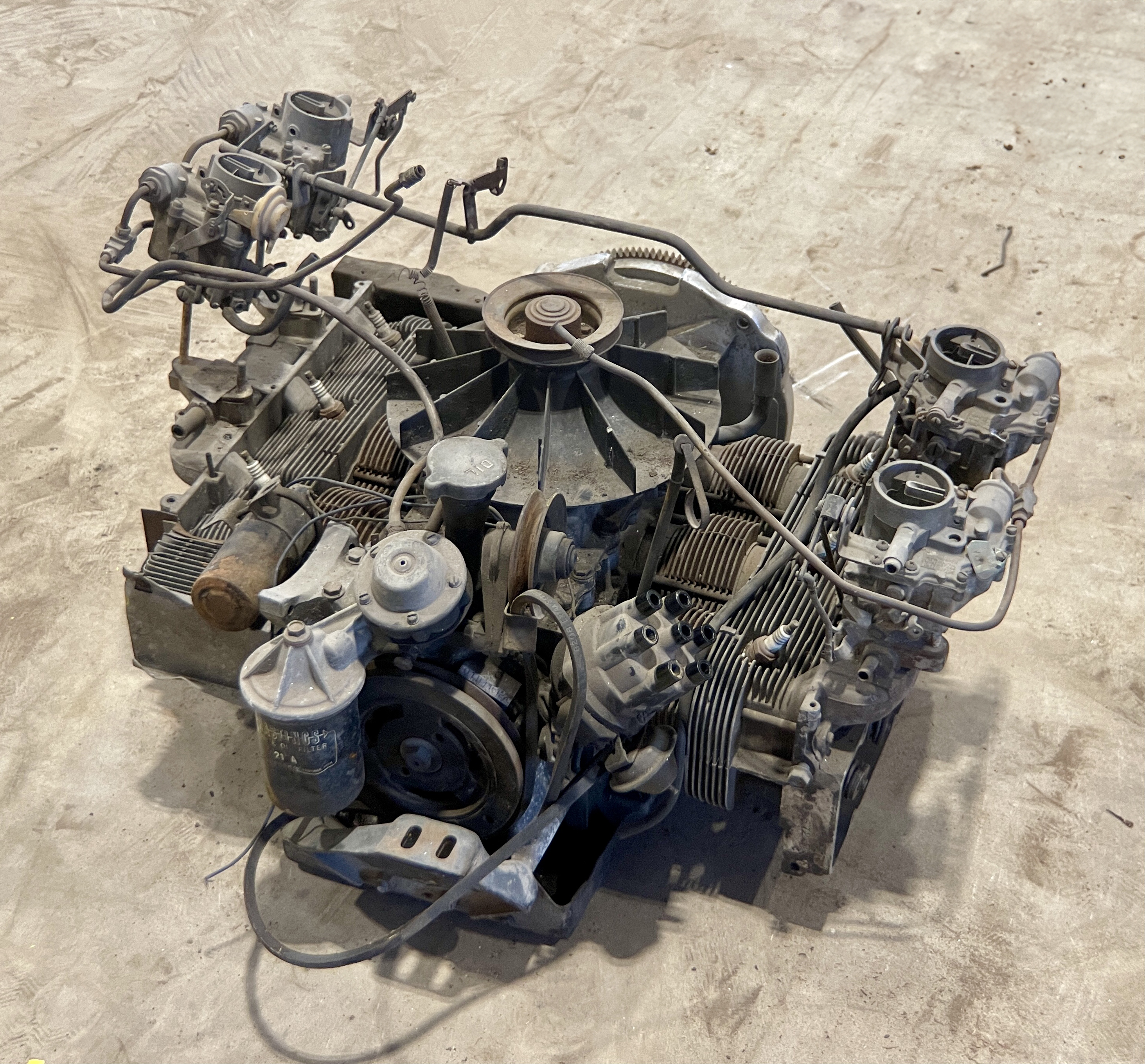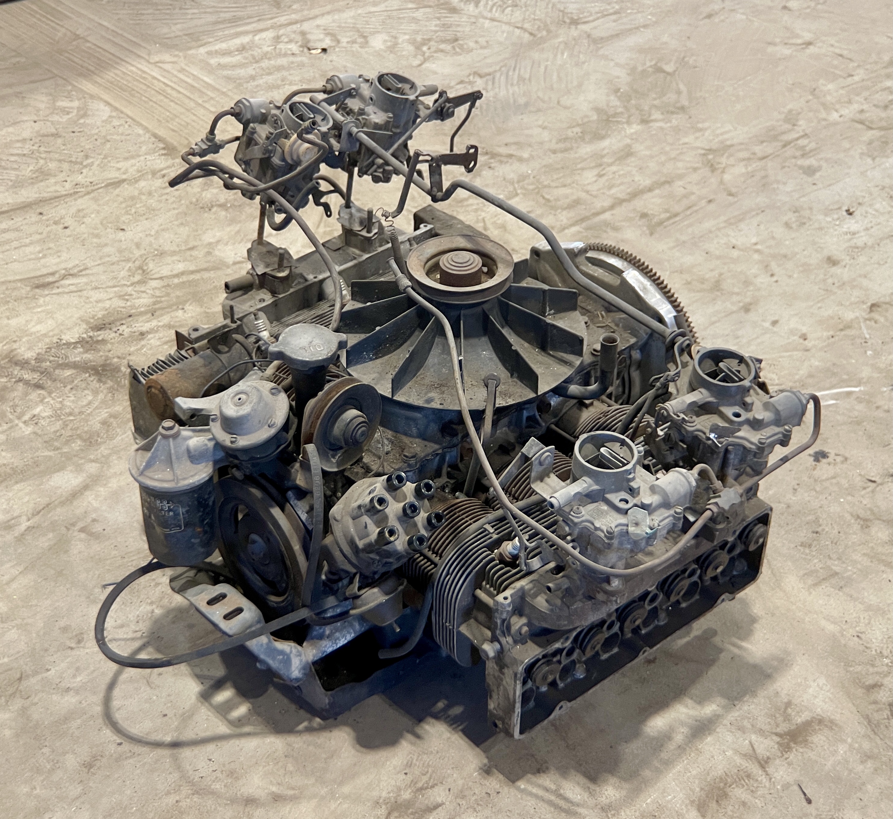 THIS MOTOR HAS BEEN MODIFIED VIA AN ADAPTER PLATE (CASTING), REPLACING THE TRADITIONAL CORVAIR BELL HOUSING, ALLOWING IT TO BOLT TO A VW TRANSAXLEBOTH THE FLYWHEEL AND CLUTCH ASSEMBLY HAVE ALSO BEEN SWAPPED FOR VW PERFORMANCE PARTS.IT ALSO APPEARS THAT THIS CORVAIR TURBO ENGINE WAS “REVERSED” TO RUN IN A CLOCKWISE DIRECTION, AND NOT THE STANDARD STOCK DIRECTION, THEREBY ELIMINATING THE NEED TO FLIP THE RING GEAR ON THE VOLKSWAGEN TRANSAXLE.